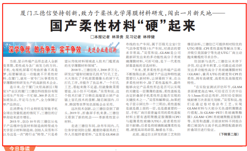 为大力宣传中国制造“隐形冠军”,推广隐形冠军企业的奋斗历程、成功经验和发展模式,引导制造业高质量发展,《福建日报》与【华体会官网】联合陆续推出“隐形冠军”专题报道。以下是专题报道第一篇厦门三德信(协会会员企业)的宣传报道,《国产柔性材料“硬”起来——厦门三德信坚持创新,致力于柔性光学薄膜材料研发,闯出一片新天地》,刊发于今日《福建日报》头版。